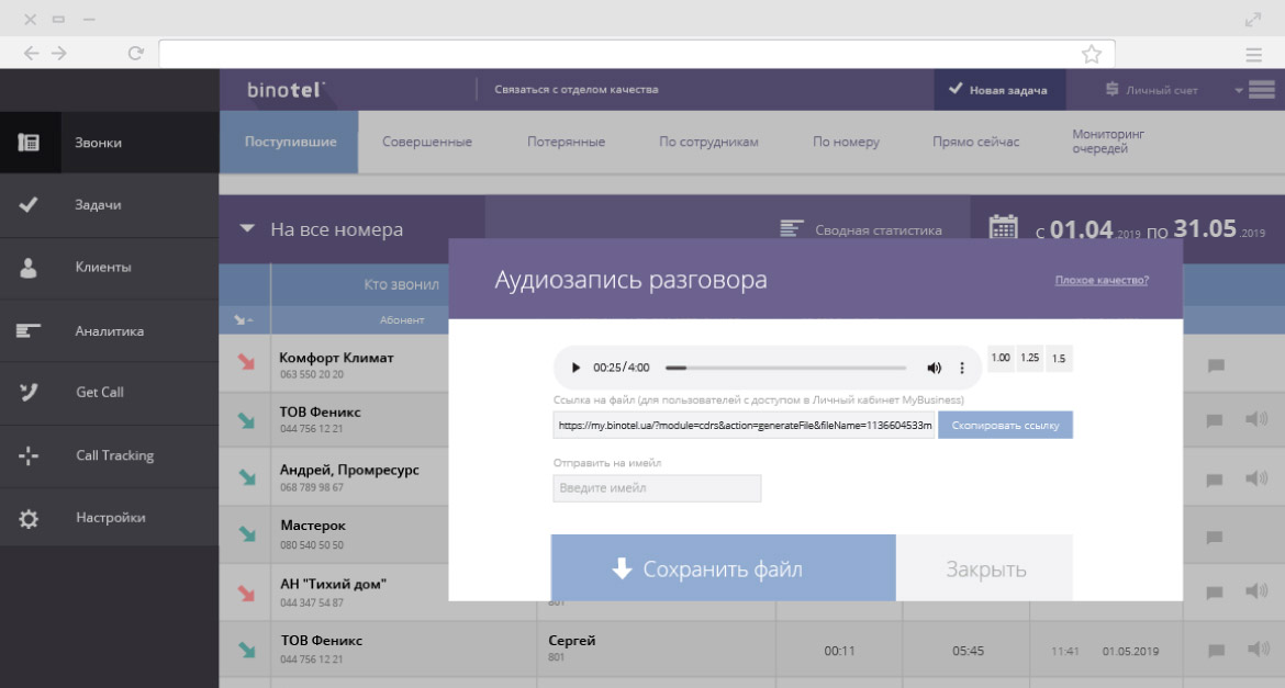 У вас будет запись всех звонков. Это значит, что вы сможете прослушать любой разговор менеджера с клиентом. Сам факт наличия этой функции мотивирует сотрудников работать более эффективно. Решать спорные вопросы и обучать новых сотрудников значительно быстрее и проще.